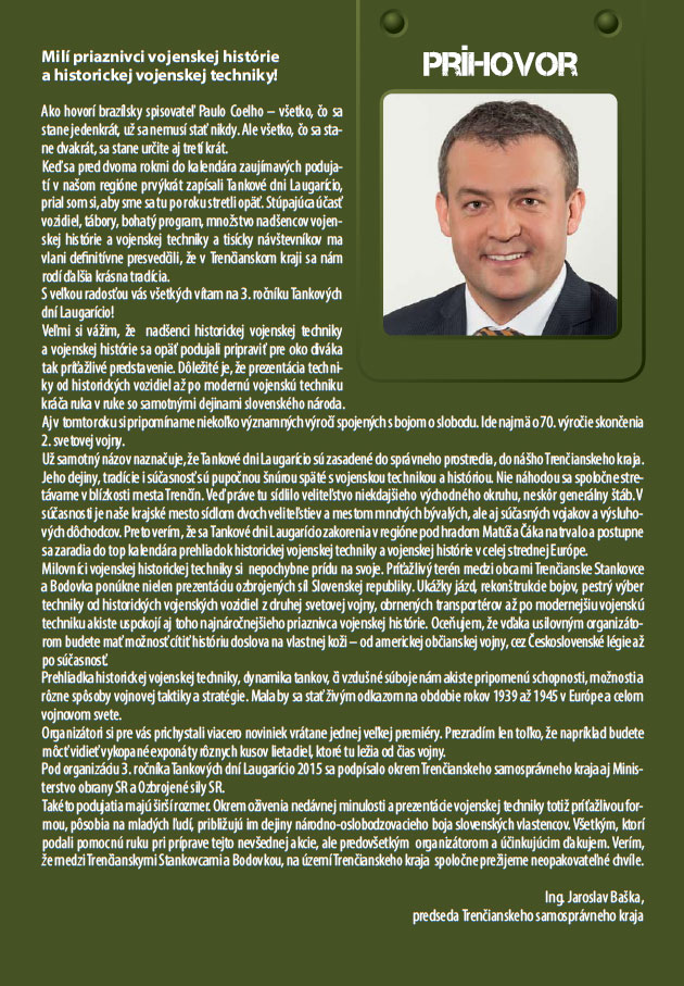 Som hlboko presvedčený, že je zasadené do správneho prostredia, do nášho Trenčianskeho kraja. Jeho dejiny, tradície i súčasnosť sú pupočnou šnúrou späté s vojenskou technikou a históriou. Nie náhodou sa spoločne stretávame práve v blízkosti mesta Trenčín. Pohľad do histórie prezrádza, že tu sídlilo veliteľstvo niekdajšieho východného okruhu, neskôr generálny štáb. V súčasnosti je Trenčín sídlom dvoch veliteľstiev a mestom mnohých bývalých, ale aj súčasných vojakov a výsluhových dôchodcov. Preto verím, že sa Tankové dni Laugarício zakorenia v regióne pod hradom Matúša Čáka natrvalo a postupne sa zaradia do top kalendára prehliadok historickej vojenskej techniky a vojenskej histórie v celej strednej Európe.